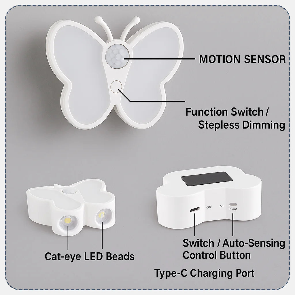 The LED Butterfly Sensor Night Light is a stylish and practical light that may be mounted in any room. Its sensor turns on when it detects motion to conserve energy, and it is convenient. The dimness of the LED gives a calming and cozy feeling and it is best suited for a bedroom, corridor or children's bedroom. Its design is such that it looks like a butterfly and in so doing gives a classy and elegant feel to your interior design. The night light is not very large and it can be easily installed and the rechargeable battery implies that it does not have to be plugged and unplugged very often. It illuminates the darkness, makes you feel safe at night, or even makes the surrounding more warm. LED Butterfly Sensor Night Light offers both convenience and style, combining functionality with elegant design.